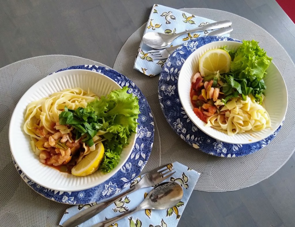 Kokkasin helpon ja maittavan katkarapupastan. Paloittelin ja kuullotin sipulit, purjon ja inkiväärin. Kuullotin ne oliiviöljyssä kuumalla pannulla. Lisäsin lopuksi tomaatit ja maustoin sitruunan mehulla ja yrttisuolla. Katkaravut ja tuore basilika pääsivät sekaan viimeiseksi.