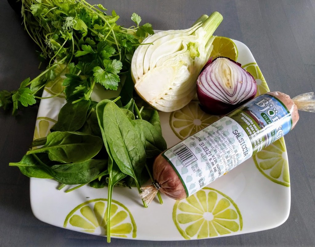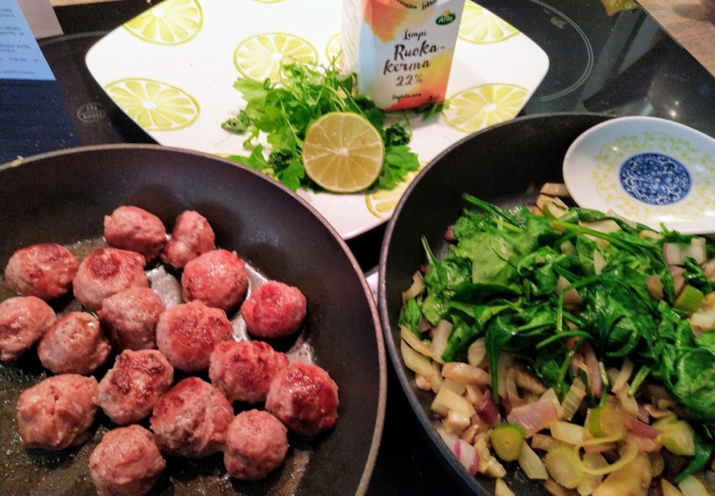 Kuullotin kasvikset oliiviöljyssä ja lisäsin lopuksi ruokakerman. Paistoin makkarapallerot toisella pannulla. Fenkoli ja punasipuli sopivat hyvin yhteen.