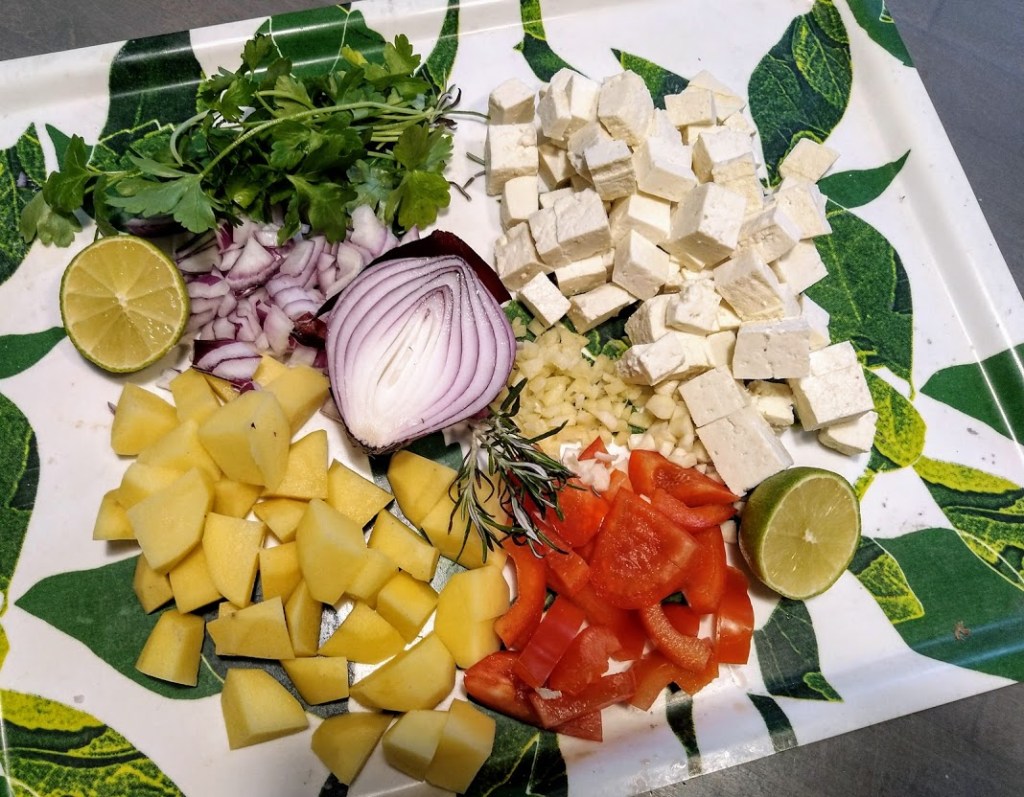 Kuullotin ja kypsensin kasvikset ja paistoin tofut erikseen. Maustoin reippaasti, yhdistin ainekset, lisäsin tuoretta limeä ja persiljaa.