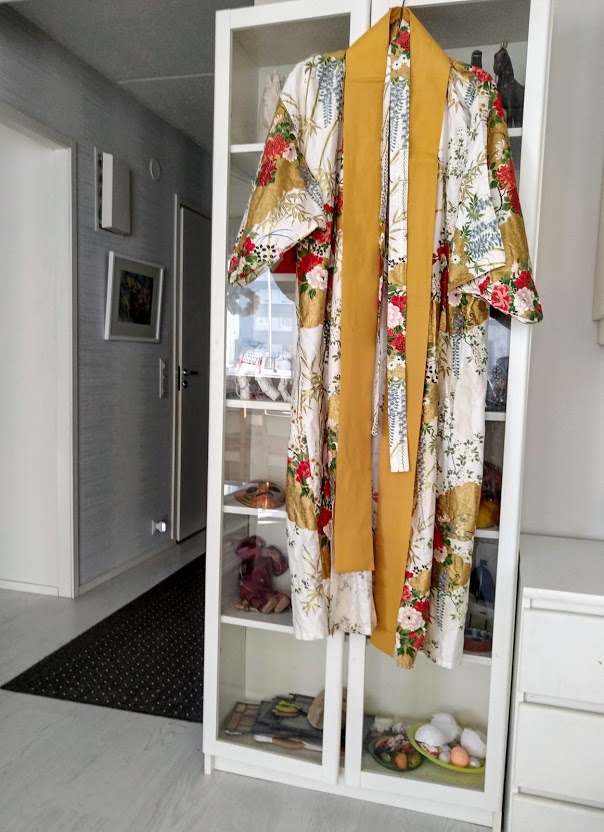 Anna toi tuliaisina aidon japanilaisen kimonon. Kiitos siskolle, joka siivoaa parhaillaan komeroita. Hän on muuttoaikeissa. Kimonomaalari kiittää.