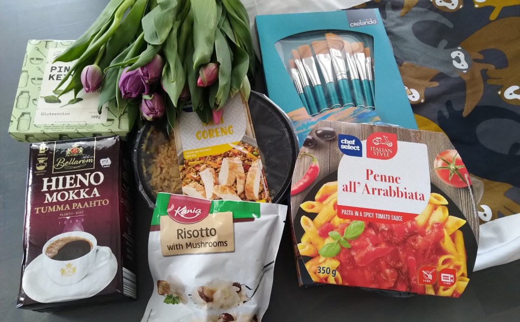 Mitä lomalainen kokkaa lounaaksi? Valmisannoksia tietenkin. Ostin testimielessä erilaisia pakkauksia. Ostin myös uusia siveltimiä, tarjouksessa olevia maalauspohjia ja tietenkin tulppaaneja silmän iloksi. Toivon edistyväni tänään maalaushommissa. Olen saanut aikaiseksi kolme keskeneräistä työtä.