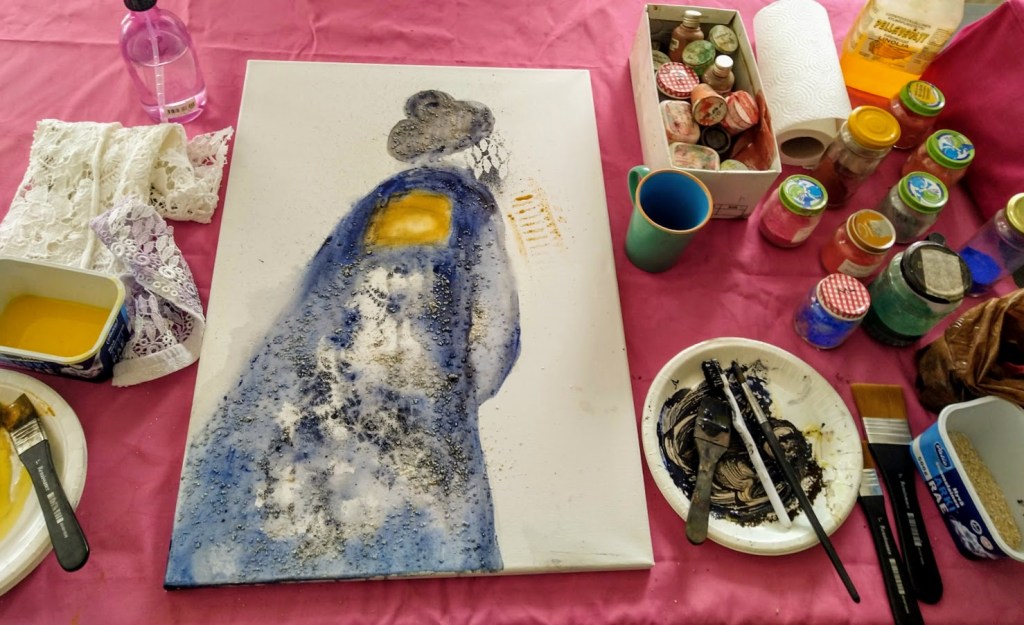 Aloitin lupaukseni mukaan maalaushommat. Kävin työhuoneella ja toin pigmentit ja pellavaöljyn kotiin. Nyt ensimmäinen temperatyö on aloitettu. Minulla on viikko aikaa valmistaa maalaukset seuraavaan näyttelyyn. Olen innosta piukea.