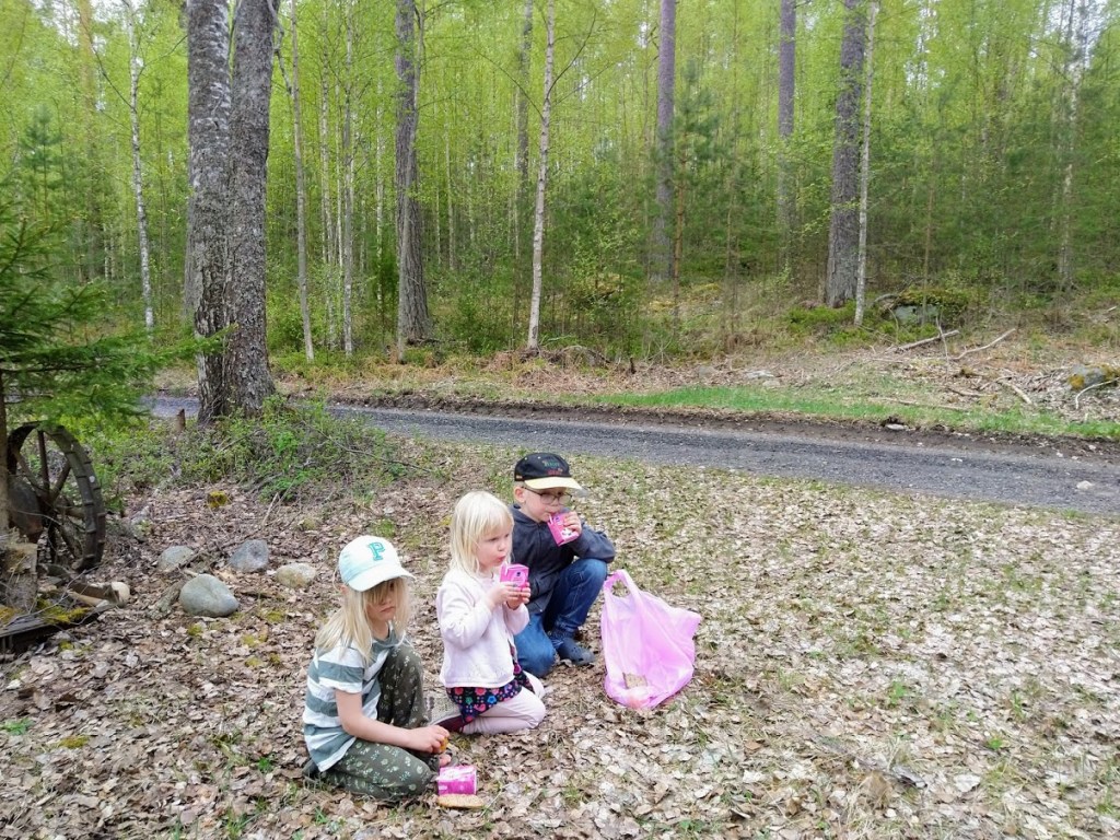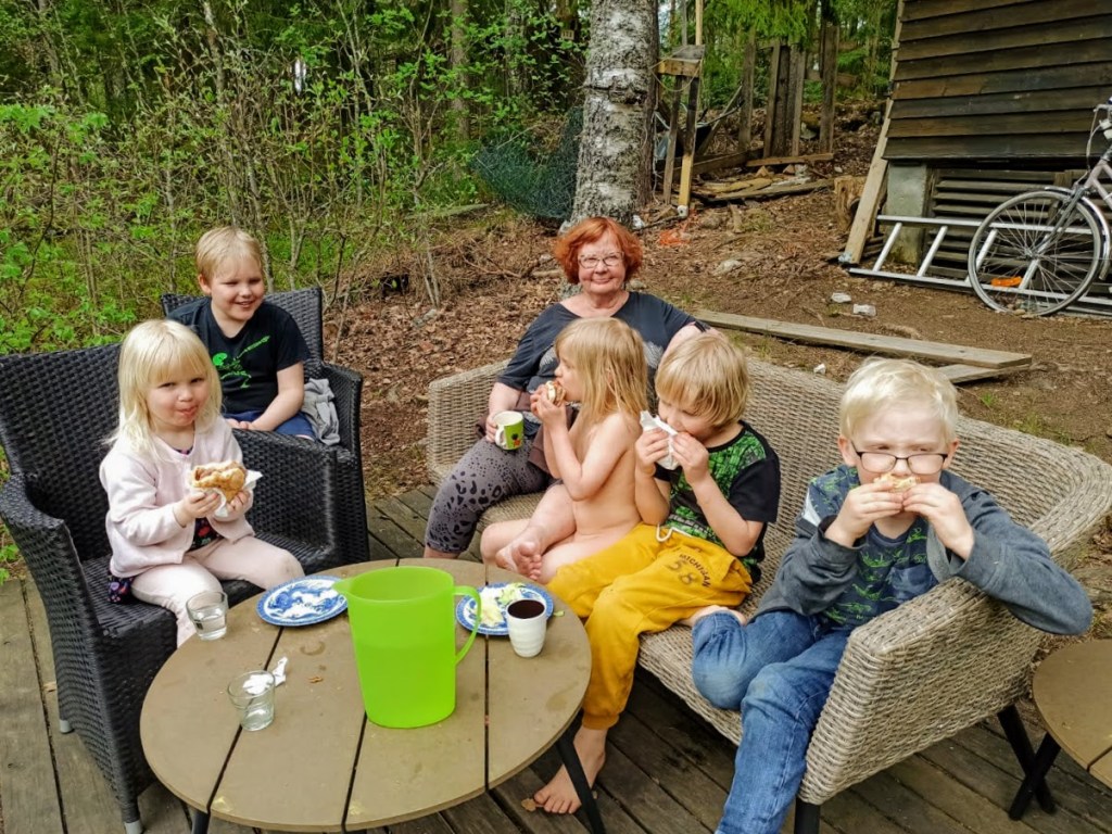 Anna, pojat ja Jussi tulivat lauantaina iltapäivällä Hämeenlinnaan. Jatkoimme saman tien matkaa mökille Hattulaan. Mökki oli siisti vapun jäljiltä. Samu ja Miska kantoivat puita ja Jussi sytytti takan. Anna ja minä laitoimme puhtaat vuodevaatteet sänkyihin. Sen jälkeen olimme valmiit juhlimaan.