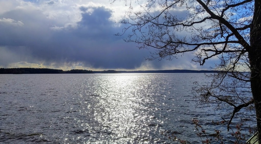Järvi oli tyyni ja aurinko lämmitti vielä illalla. Anna ja pojat virittelivät koivuun mahlanjuoksutuspullon. Liekö koivu kovasti vanha ja kuiva, mahlaa tuli vain vähän.
