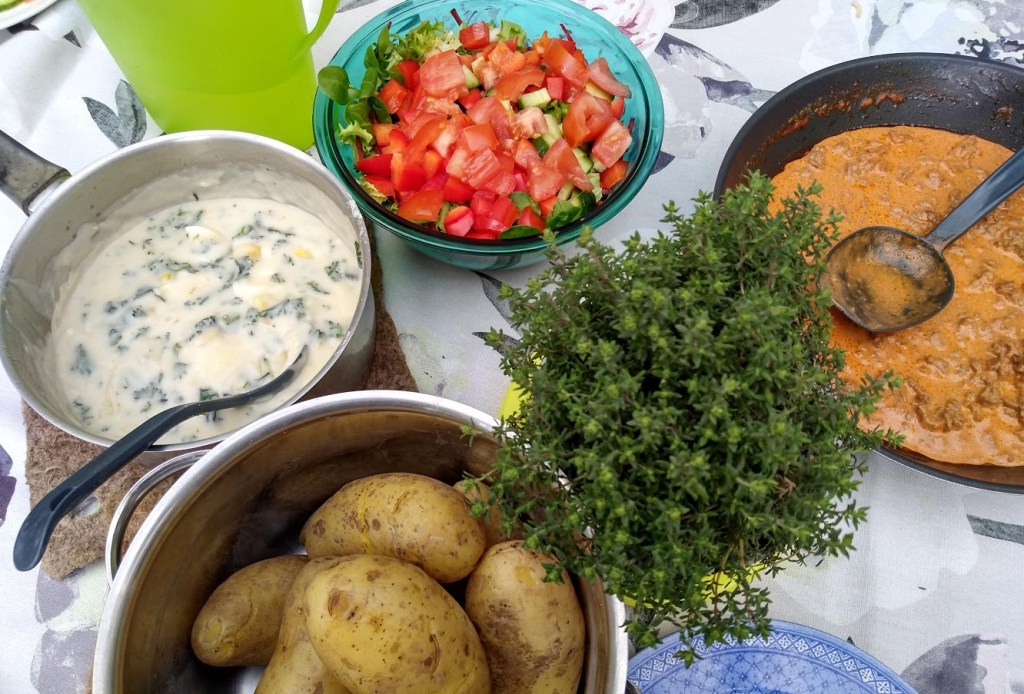 Söimme ensimmäisen kerran tänä vuonna ulkona. Tarjolla oli lasten toivomuksesta spaghettia ja jauhelihaa, aikuisille nokkosmuhennosta ja perunoita.
