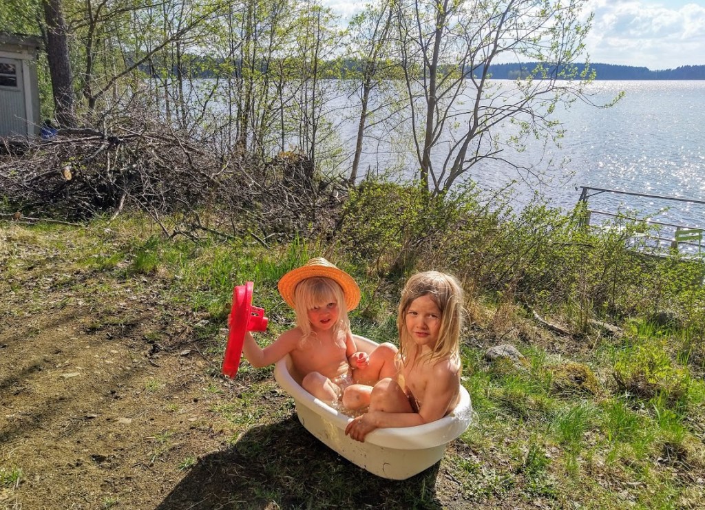 Luonto oli herännyt viikossa. Alkukesän heleys on aina yhtä hämmästyttävää. Pikkupojat kirmailivat nakuina mökkipihalla ja kävivät kastautumassa järvessä.
