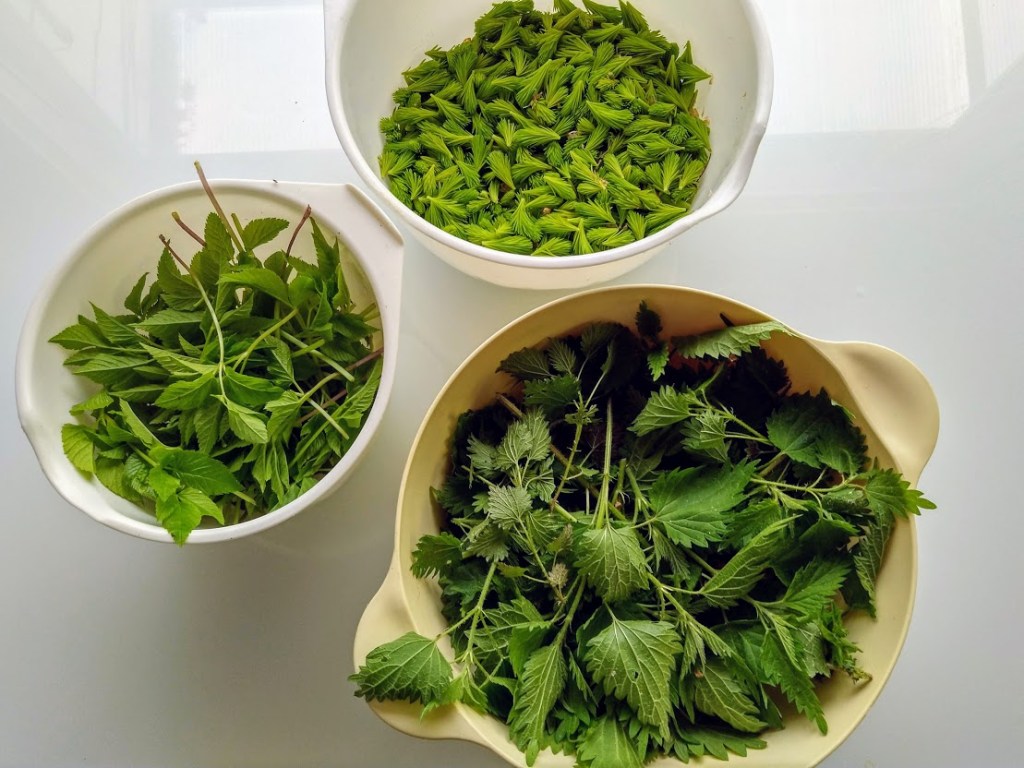 Anna on innostunut kevätversoista. Hän keräsi tuoreita kuusenkerkkiä ja laittoi ne muscovadosokerin kanssa tekeytymään. Minä kokkasin meille viherpaistosta, johon tuli ryöpättyjä nokkosia ja vuohenputkia. Maustoin sitruunapippurilla, valkosipulilla ja tilkalla kermaa. Hyvää, sanoi Anna.
