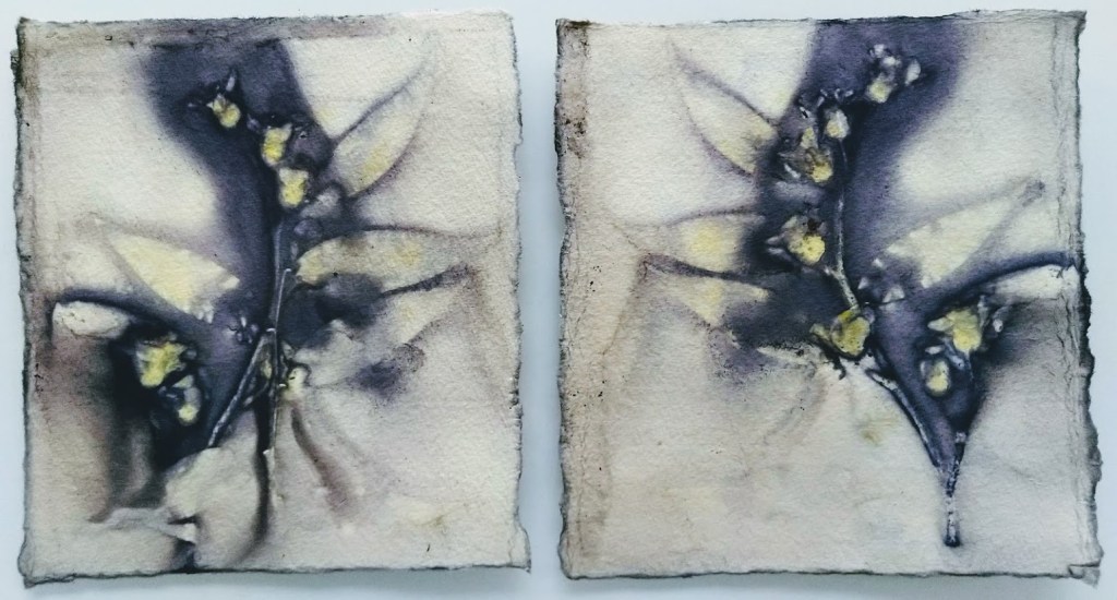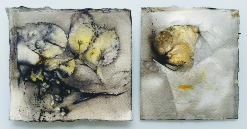 Olen ihastunut taiteen lajeihin, joissa tapahtuu jotain yllätykellistä. Niin nytkin. Jotkin kasvit luovuttivat vain niukasti väriä, jotkut taas runsaasti. Suunnittelimme, että jatkamme harjoituksia syksyllä, jolloin valittavana on uusia kasveja.