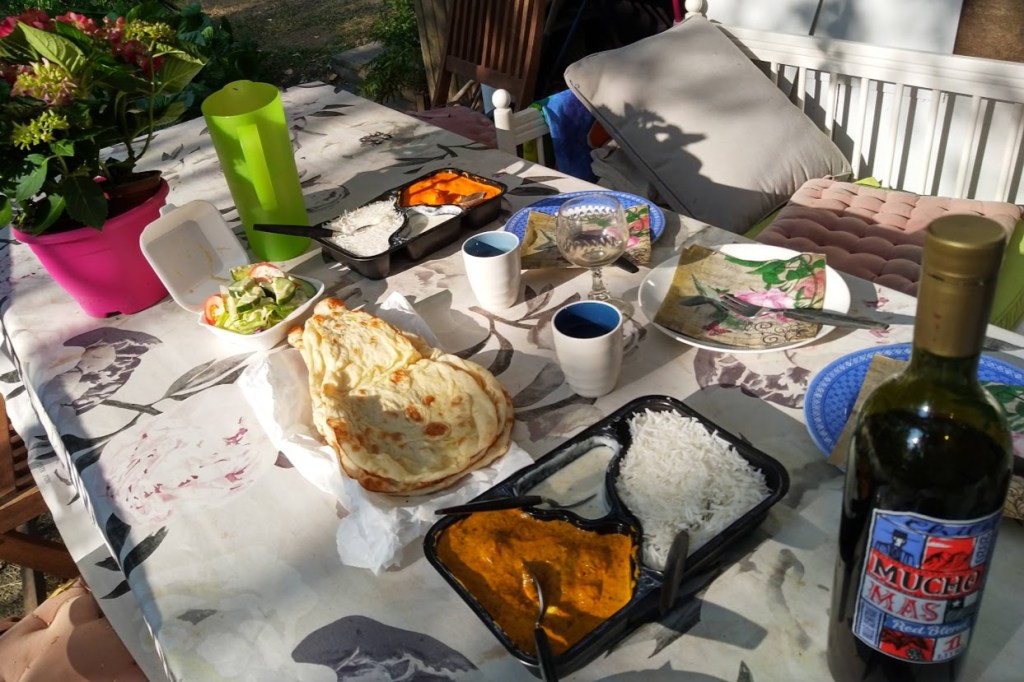 Kesälomalaiset tulivat illalla tuliaisten kera. Butter chicken ja Palak paneer sekä lämpimät naanleivät maistuivat herkullisilta kotiruuan jälkeen viinistä puhumattakaan.