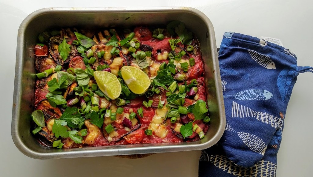 Ladoin ainekset uunivuokaan paseeratun tomaatin ja kasvimaalta poimimieni yrttien kera. Paistoin kuumassa uunissa puolisen tuntia.