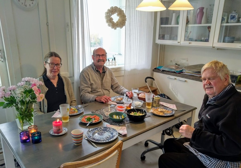 Tein blinitaikinan ja hankin lisukkeet ennen vieraiden tuloa. On ylellistä tarjota lettuja melkein suoraan pannulta. Mietin jälkiruokaa, mutta Jussin mielestä viimeiset blinit voi valella hunajalla ja suu jää makeaksi. Lii ja Kaizu toivat tuliaisiksi mehevää mustikkapiirakkaa, joten suut olivat todella makeat aterian jälkeen.