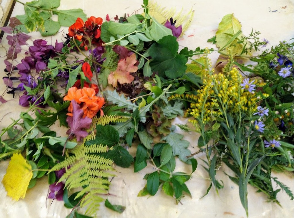 Kontaktivärjäyskurssi sujui huonosti, vaikka syyskasveja oli tarjolla runsaasti. Värit tarttuivat vain haaleasti paperille. Olin oikein pettynyt.