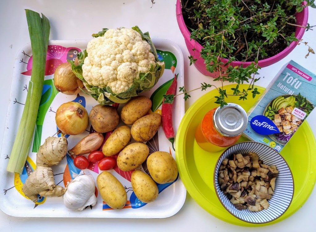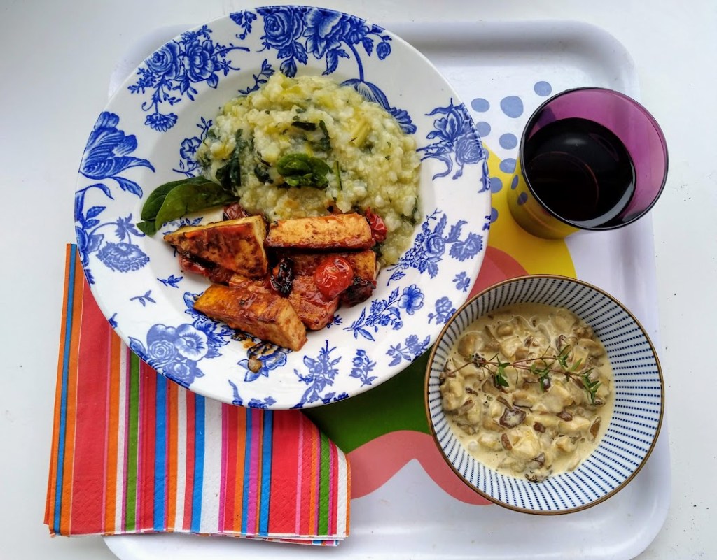 Nyt tein kevennetyn version kukkakaalin, purjon ja pinaatin kera. Sulatin pussillisen Suvelan herkkutatteja ja haudutin ne kermassa, nam. Pidän myös tofusta, kun sen maustaa kunnolla chilillä ja soijakastikkeella valkosipulia unohtamatta.