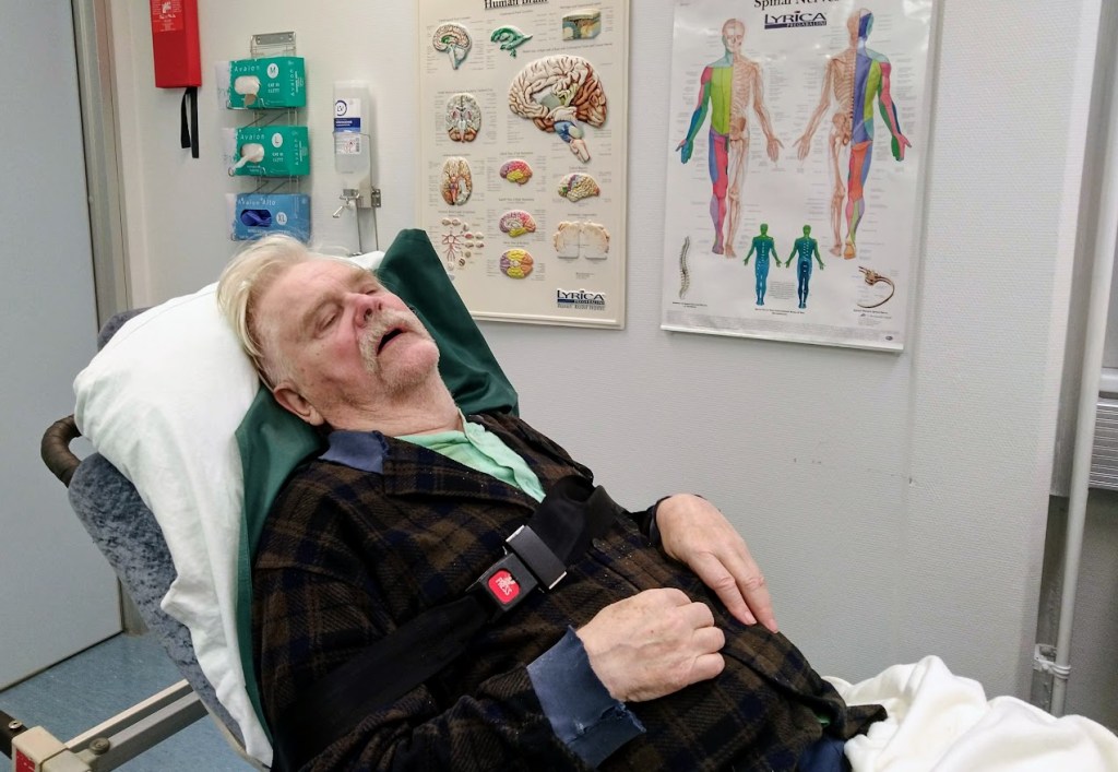 Fysioterapeutit ovat kirjanneet, että kävely on huteraa. Tarvitaan kaksi hoitajaa nostamaan Jussi sängystä ja kävelyttämään rollaattorin avulla huoneessa olevaan wc:hen. Ei ole mitään mahdollisuutta, että pärjäisimme kahdestaan kotona. ”Tästä tulee pitkä reissu”, yksi hoitajista totesi, kun kyselin jatkosta.