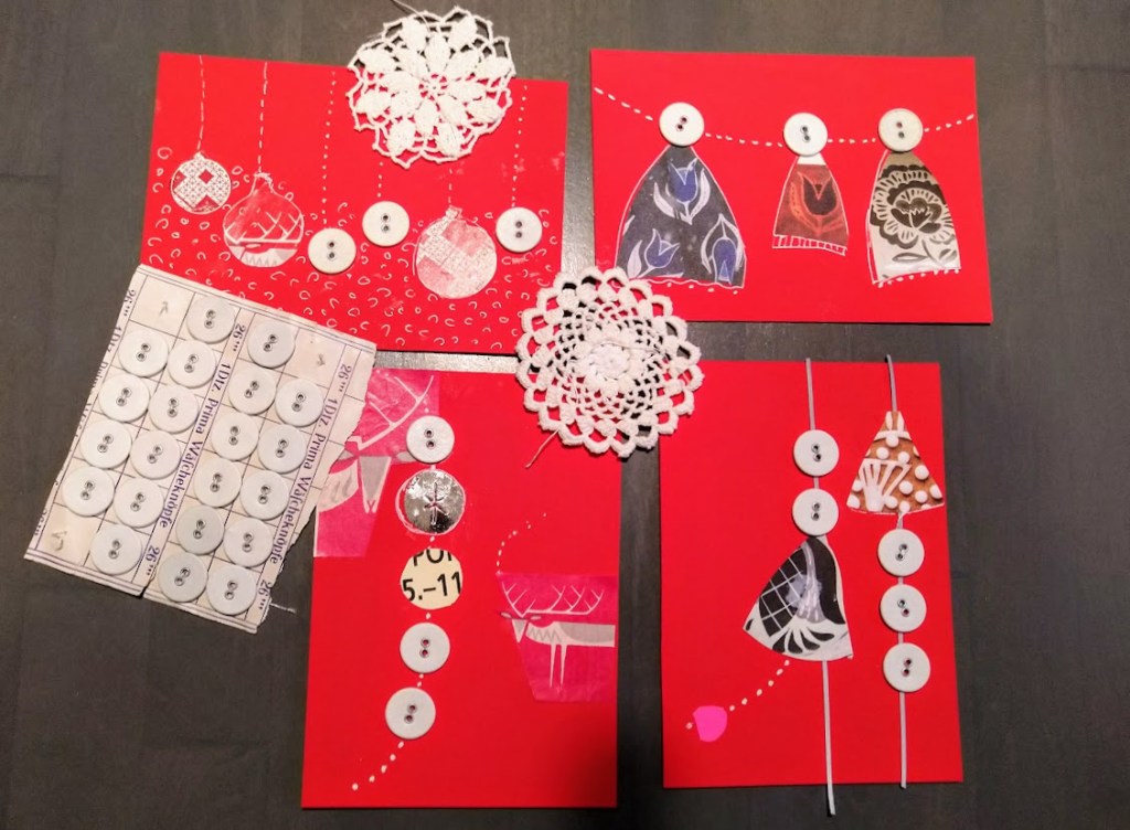 Minua viehättivät hauskat napit, joita sommittelin innolla punaisille korttipohjille.