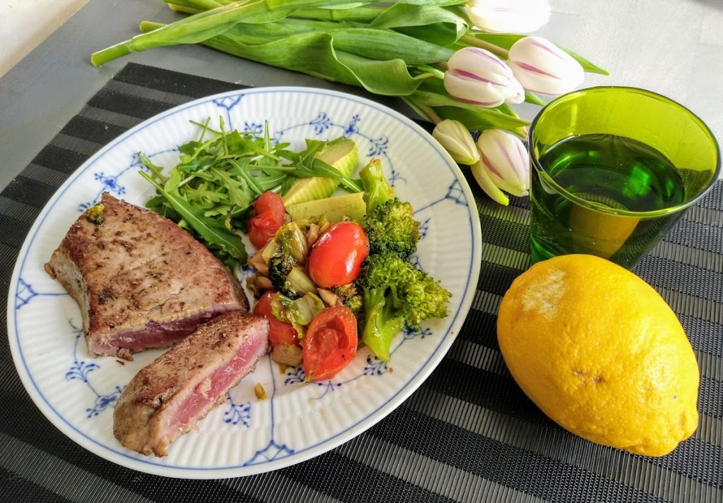 Halusin kokata yksinäisen viikonlopun iloksi jotain hyvää. Ostin tuoreen tonnikalapihvin ja terveellistä parsakaalia.
