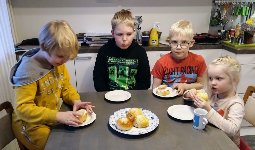Laura toi Laviasta jälkiruoaksi herkulliset laskiaispullat. Jokainen sai täyttää ne maun mukaan. Tarjolla oli kermavaahtoa, mansikkahilloa ja marsipaania. Miikan perhe jatkoi illalla matkaa Espooseen, vaikka Otso ja Visa olisivat halunneet jäädä serkkujen kanssa yöksi. Anna ilmoitti tomerasti, että edellinen kerta oli niin villi, ettei hän halua paimentaa neljää poikaa kerralla.