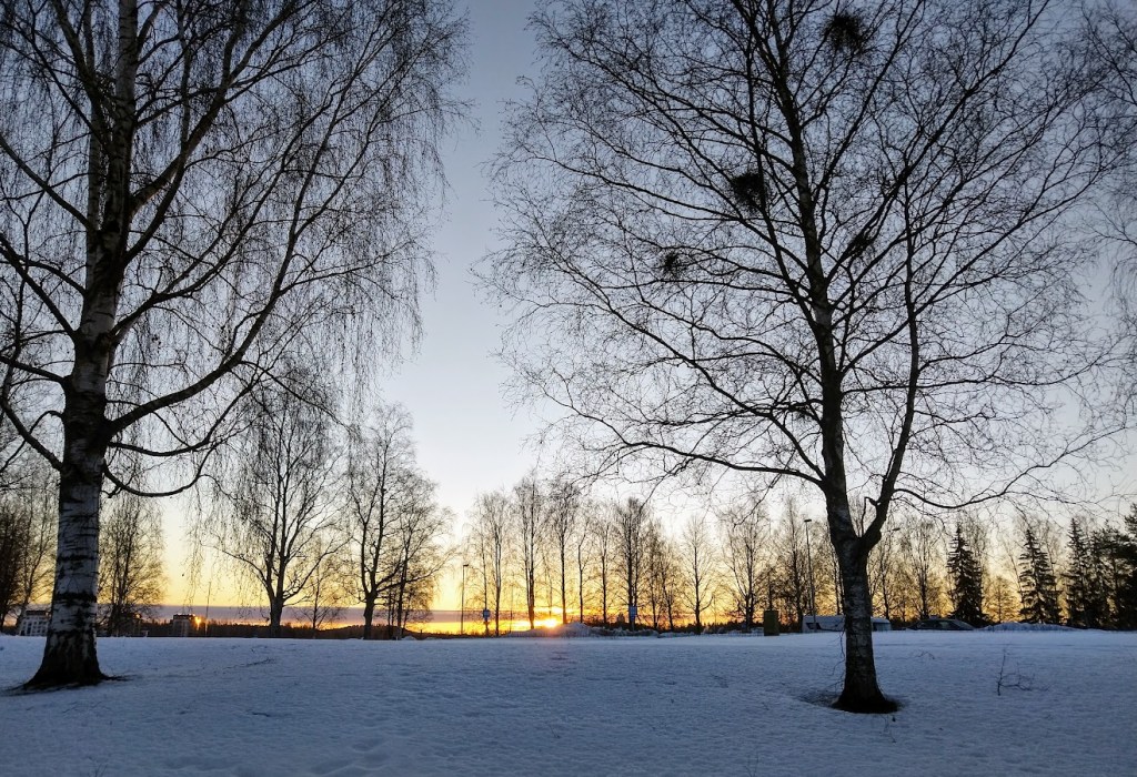 Aurinko pilkahteli pitkästä aikaa, mutta pakkasta oli rutkasti. Mittarissa oli aamulla -18 astetta. Annalla ja Miikalla alkoi talviloma.