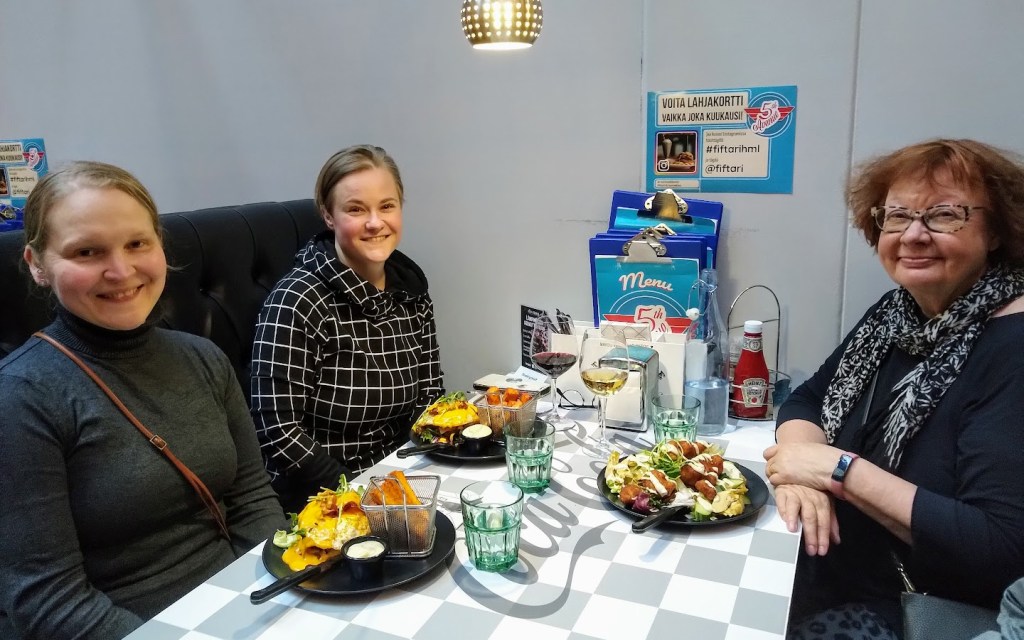 Sain yllättäen koko joukkueen vieraiksi. Anna, Samu ja Miska tulivat junalla ja lupasivat jäädä yökylään. Miika toi koko perheen. Ohjelmaa riitti koko päivälle. Nuoriso kävi uimahallissa. Lapset viihtyivät niin hyvin, että päivä oli melkein illassa ennen kuin pääsimme syömään. Miika vei nuorison pizzalle ja minä karkasin Annan ja Lauran kanssa Fiftariin.