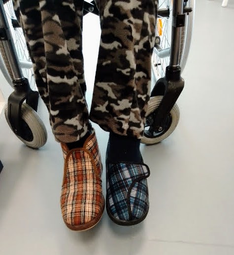 Jussinkin askel on keventymässä, sillä Visarannassa kävi eilen kenkäesittelijä. Omahoitaja Kerttu laittoi viestin, että Jussi ihastui kuvassa oleviin sinisiin tohveleihin. ”Saako ostaa, ovat laadukkaat, maksavat 50 euroa?” Vastasin, että kaikki mikä tuottaa Jussille mielihyvää, onnistuu. Kerttu on nyt Jussin ykkösomahoitaja. Tero oli saanut paremman tarjouksen ja irtisanoutui. Kakkosomahoitaja on kiharatukkainen Eija.
