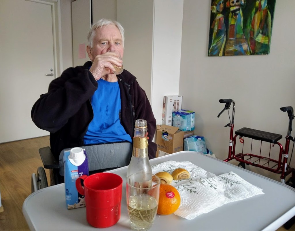 Jussi oli hetken niin virkeä, että soitimme hänen sisaruksilleen Leenalle ja Eskolle. Sitten voimat loppuivat ja hän nukahti pyörätuoliin. Tällainen vappuaatto tänä vuonna.