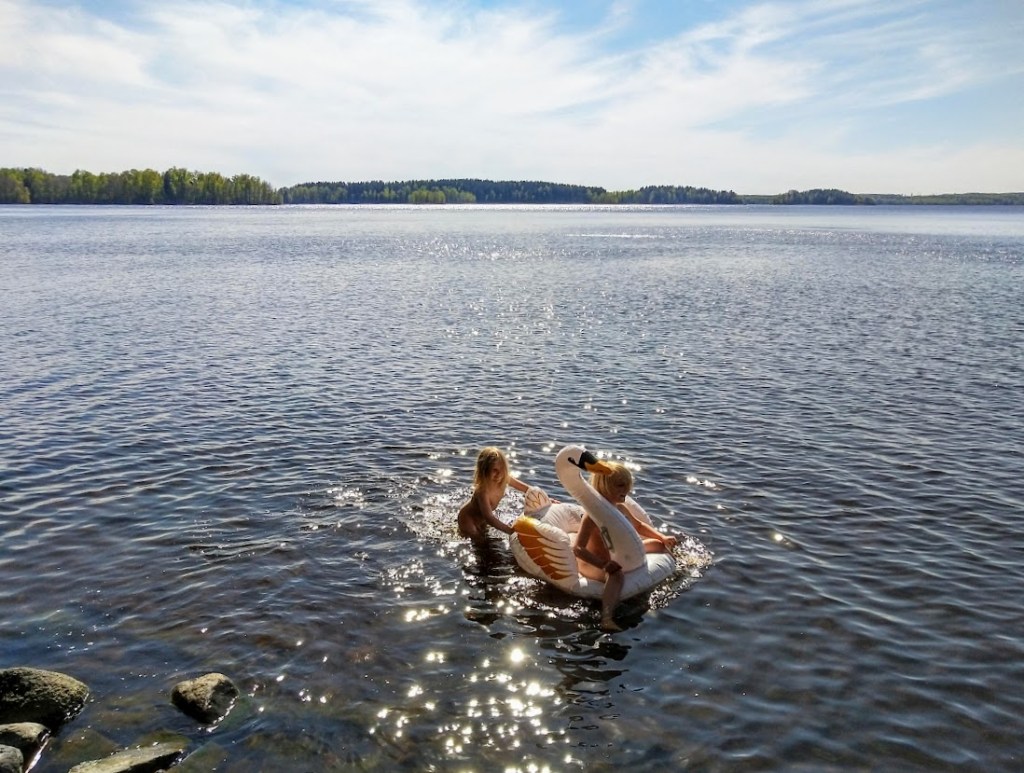 Istuimme Annan kanssa keinulla ja ihailimme rohkelikkoja. Poikia kylmä vesi ei pelottanut. ”Tänne voisi jäädä”, Anna tuumi. Mökki oli vielä talven jäljiltä kylmä, joten emme jääneet – vielä.
