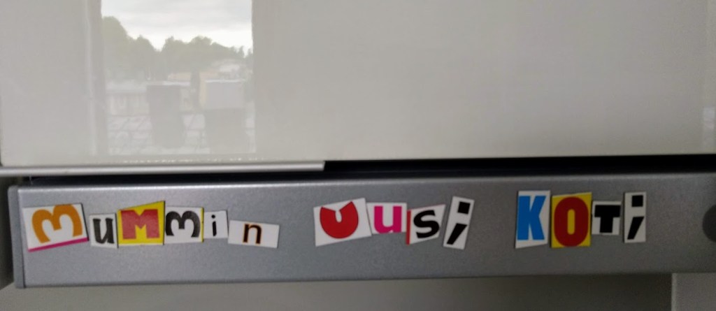 Olen kotiutunut ja viihdyn. Uusi koti on jo oman näköinen, vaikka laatikoita lojuu vielä pitkään nurkissa. Miika ehti kiinnittää vain osan hyllyistä seiniin muuttopäivänä. Se tarkoittaa, että voin purkaa tavarat vain kaappeihin ja tuettuihin vitriineihin. Lyijylasikaapillekin löytyi paikka, mutta se odottaa asennusta.