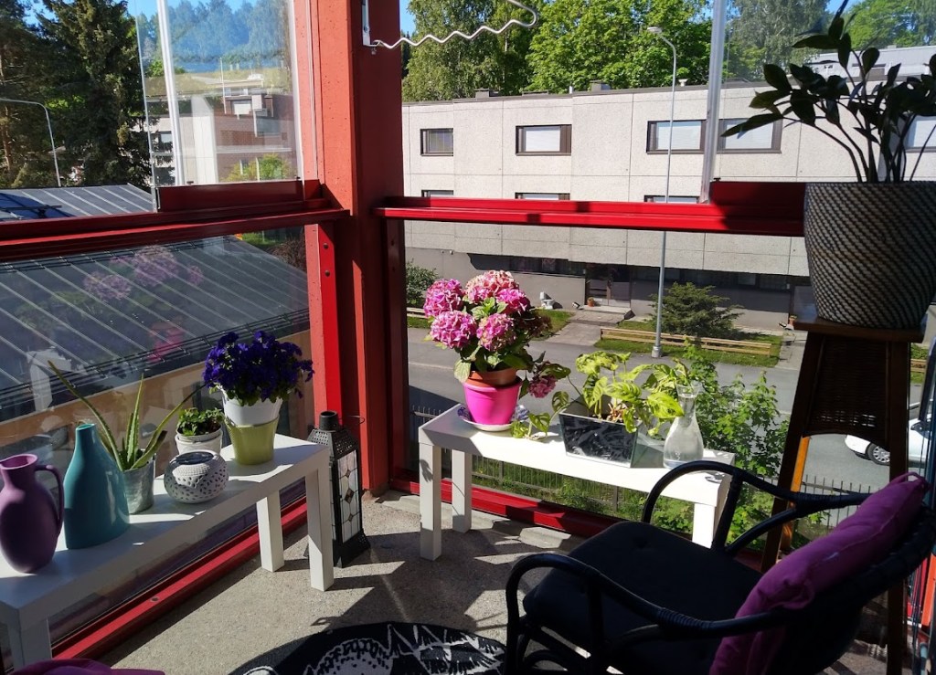 Parveke on paratiisi. Nautin auringosta ja pakenen sinne, kun tavaroiden purkaminen ahdistaa. Parveke on pieni ja kodikas. Tunnen olevani puutarhassa, sillä toin kaikki kukat ulos. Siellä on väri-ilona äitienpäivähortensia, tummansiniset orvokit, muratti, aloe vera, peikonlehti ja palmuvehka. Käänsin eilen rottinkituolia auringon mukaan etelän suunnalta länteen kohti auringonlaskua.