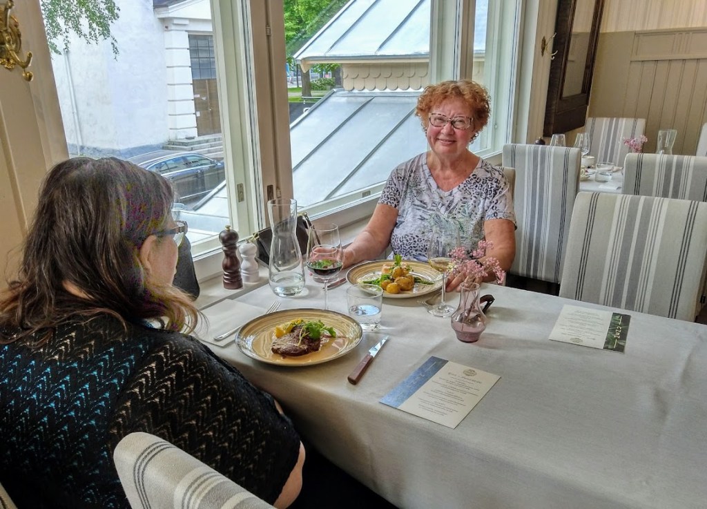 Kävimme Cantina Pannuhuoneella lounaalla. Istuimme ulkoterassilla ja nautimme erinomaiset paistetut silakkapihvit. Niissä voita ei oltu säästelty. Clas Ohlsonilta löytyi nettiyhteyttä varten langaton reititin ja käteviä taulukoukkuja.