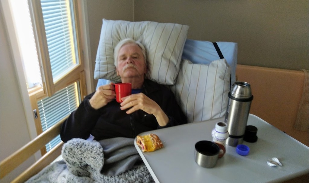 Olin silloin matkalla Palokunnankadulle siivoushommiin. Vatsanahka oli piukeana, kun odottelin tietoa miehen voinnista. Ensiavusta kerrottiin iltapäivällä, että vuotokohta on hoidettu ja Jussi pääsee takaisin hoivakotiin. Elämästä on tullut kovasti epävarmaa.