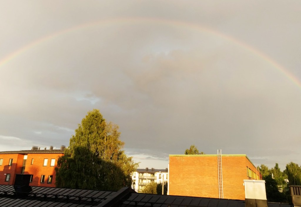 Ihailin illalla etelän suunnassa komeilevaa upeaa sateenkaarta. Päivä oli pilvinen, mutta ilta-aurinko valaisi taas kerran järkyttävän päivän. Sairaanhoitaja Veera soitti aamulla, että Jussilla on paha nenäverenvuoto ja hän lähettää miehen ensiapuun.