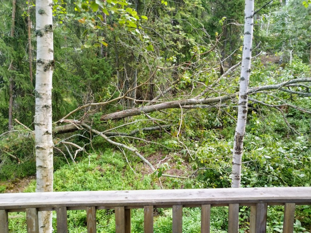 Miikaa odottaa puuhommat, sillä rinteessä on myrskyn kaatamia puita ja kaksi metsurin kaatamaa pystyyn kuollutta kuusta.