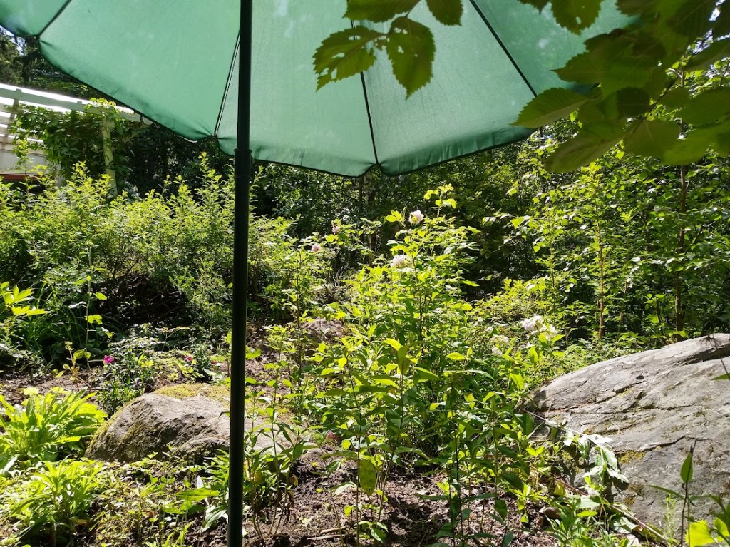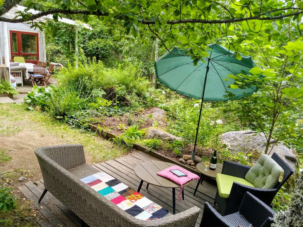 Lomaviikkoni ei ole ollut niin kesäinen, kuin kuvittelin. Oli pakko siirtyä katoksen alle lukemaan, kun keinulla oli jatkuvasti märkää. Istuin shaali harteilla.