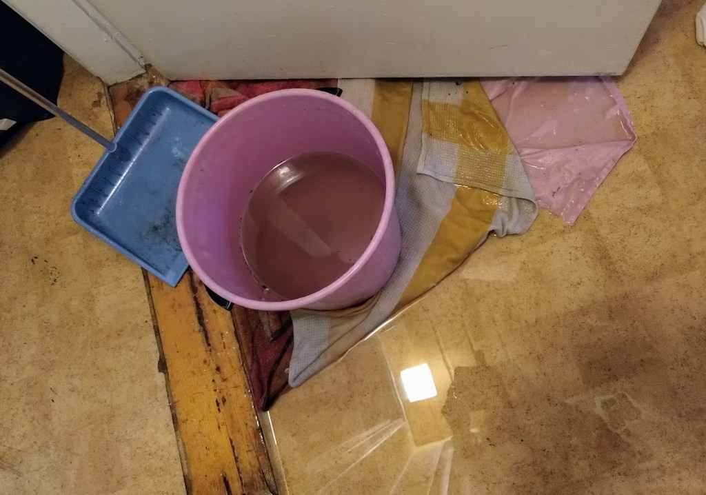 Jäin, vaikka vessa on käyttökiellossa ja viemärivesi valuu lattialle. Lapioin sitä aamuin illoin ämpäriin ja imeytän pyyhkeisiin.