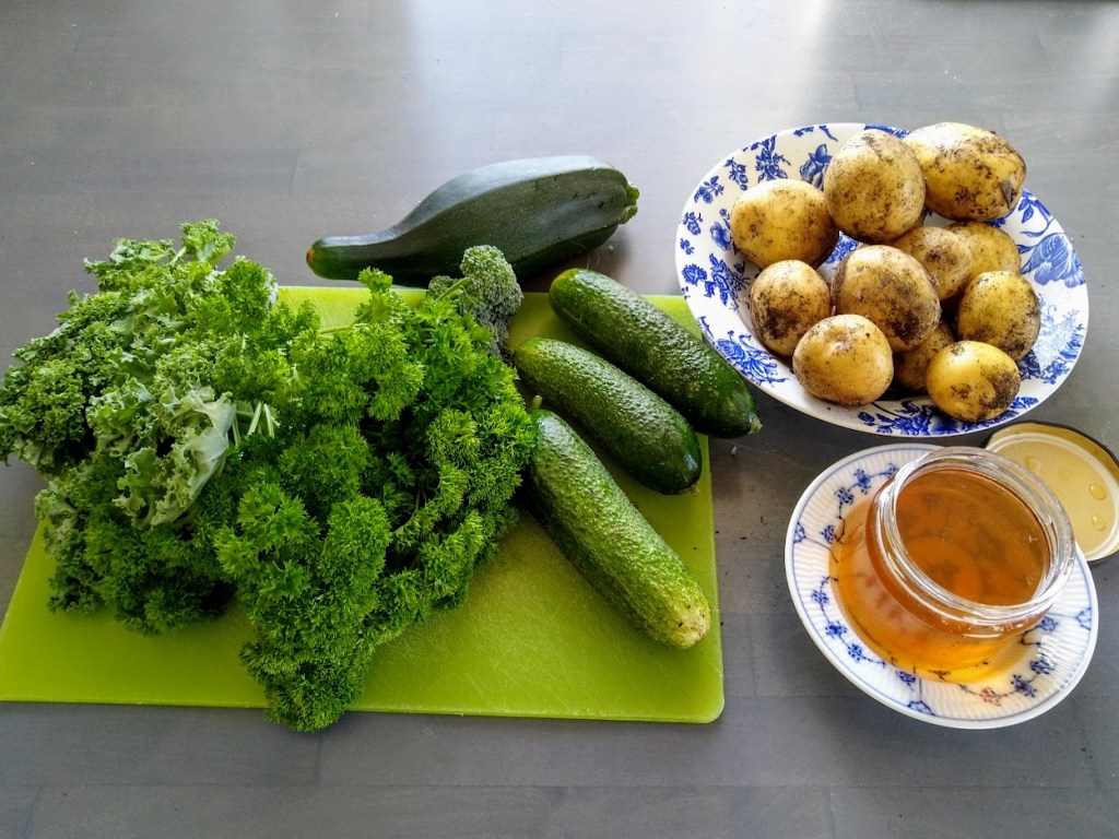 Sirpa toi tuoreita kasvimaan antimia ja mehiläiskasvattaja Erkki purkillisen tämän vuoden hunajaa. Leena kiittää.