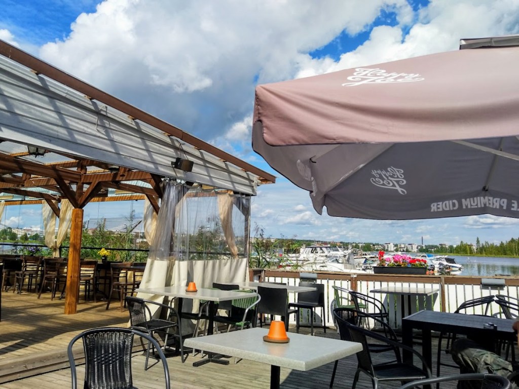 Poikkesin kotimatkalla testaamaan Virvelirannan terassin. Olut oli kylmää, mutta salaatin kastike minun makuuni turhan makeaa. Paikka järven rannalla oli kyllä kaunis.