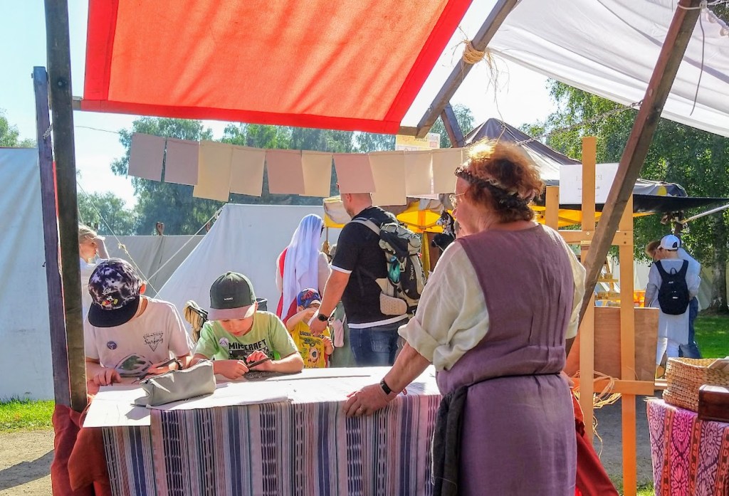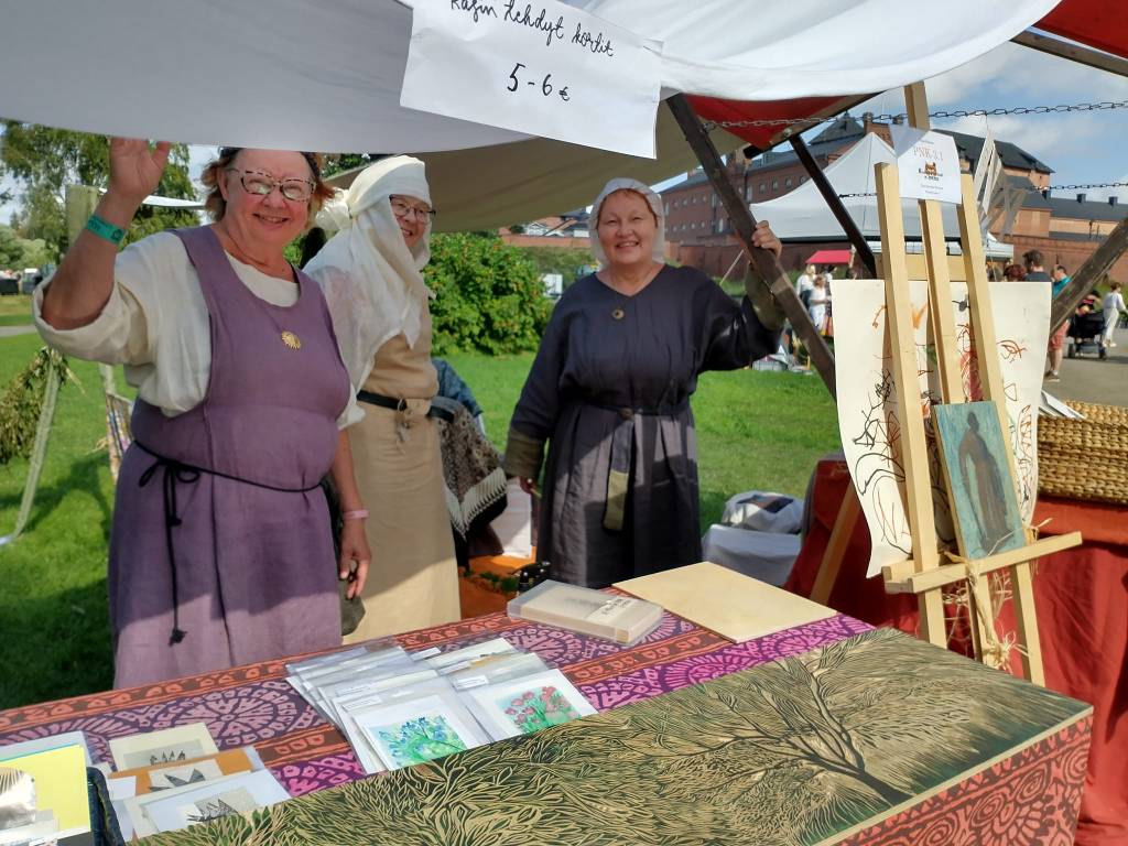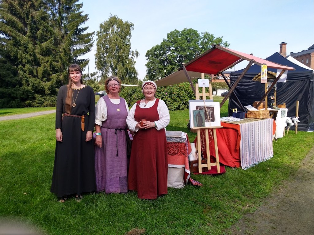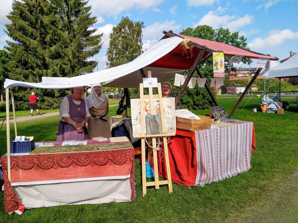 Hämeen keskiaikafestivaali käynnistyi eilen paahtavassa helteessä. Saimme iltapäivällä pienen sateenkuuron, mutta se ei menoa haitannut. Levitimme Polttavan nokkosen kujalla sijaitsevan torikojumme päälle muovin ja otimme sen melkein saman tien pois. Lauantaille on luvassa tukahduttavaa hellettä, mutta sunnuntaina sataa. Olemme varautuneet siihen suurilla pressuilla.