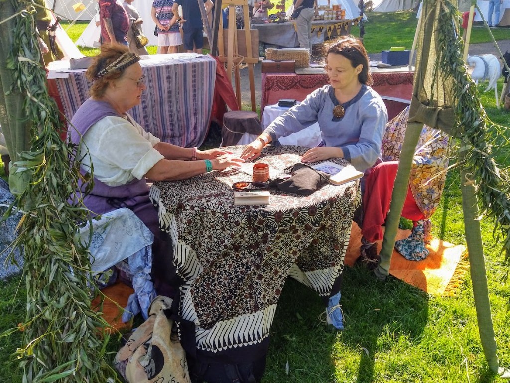 Mama Maddalenalla oli hauska päivä. Annoin toistakymmentä hyvää tarottulkintaa huumorin pilke silmäkulmassa. Kiertelimme Tiina-Katriinan kanssa tauolla katselemassa viikinkikylää, joka tänä vuonna on keskellä markkina-aluetta. Kävimme myös tavernassa nauttimassa erinomaista hapankaalia ja muovimukilliset viiniä. Odotan, että tänään lauantaina meno on eilistäkin vauhdikkaampaa.