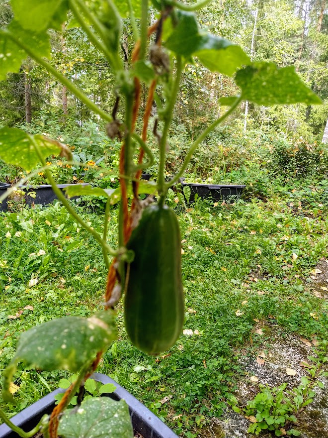 Viikonloppuna oli aika korjata satoa. Rehevä kurkku tuotti vain yhden hedelmän.Ulpu auttoi kiertämällä sen irti.