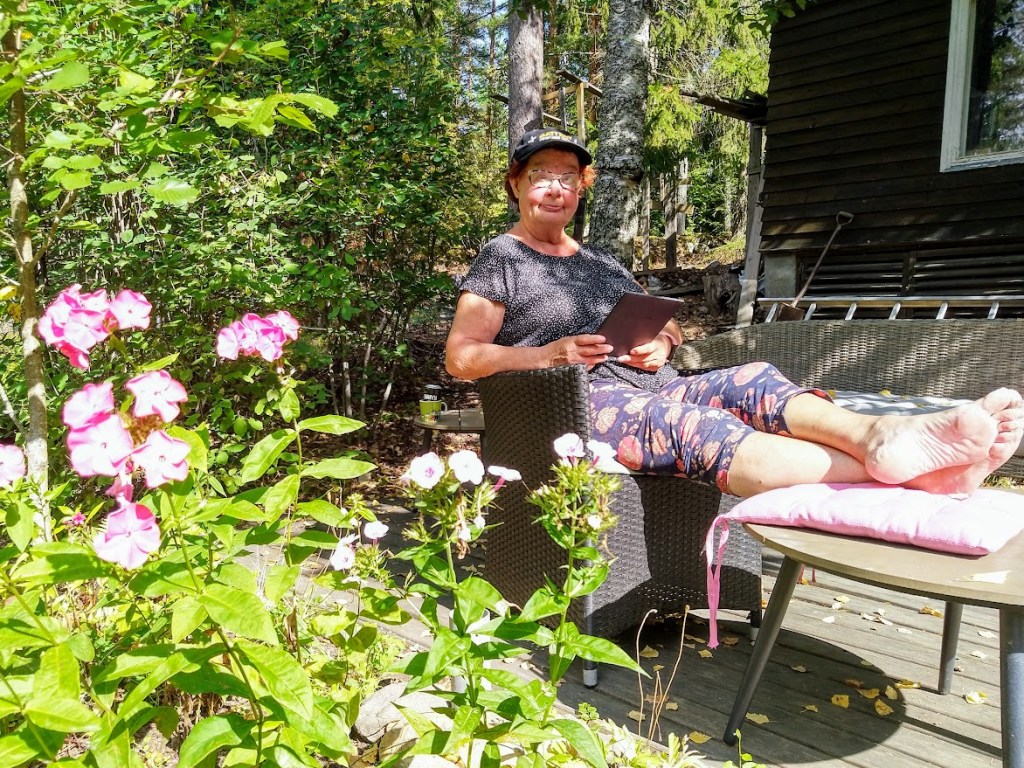 Latasin akkuja istumalla näillä näkymillä viimeisen kerran tänä kesänä keinulla lukemassa. Meneillään on kiehtova Kirsti Paakkasen elämäkerta.
