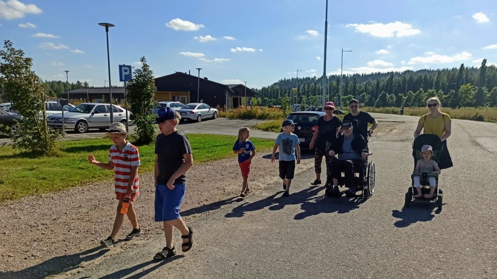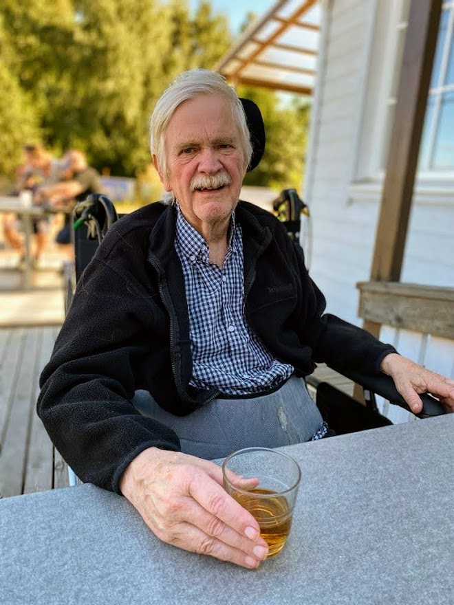 Kävimme hakemassa hänet Visarannasta. Miika työnsi pyörätuolin Virvelinrannan terassille.