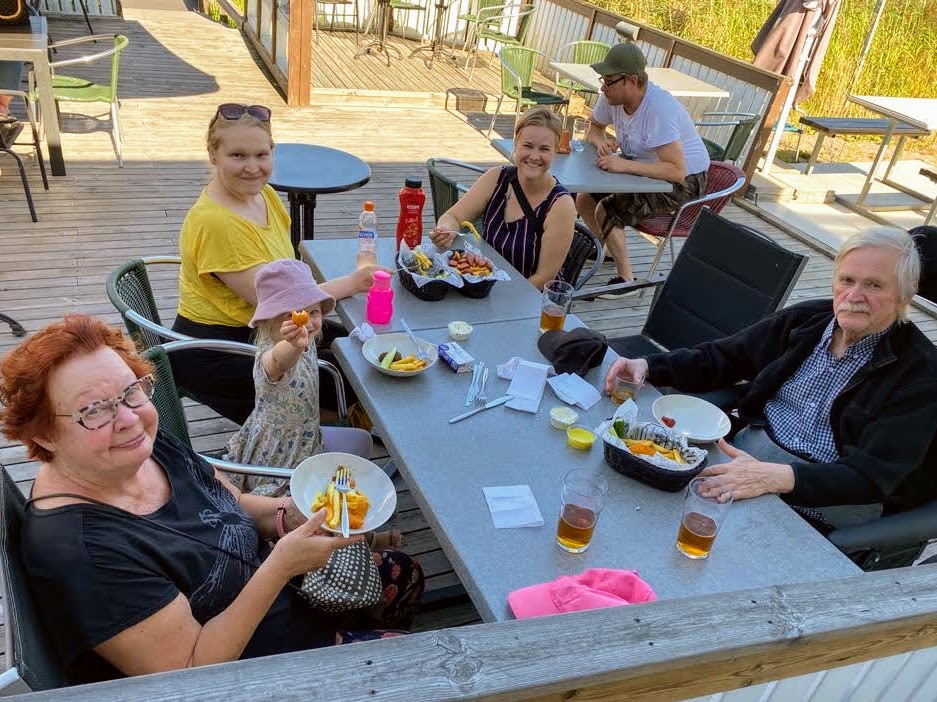 Löysimme varjopaikan. Jussi nautti pitkän tauon jälkeen oluesta, lihapullista ja ranskalaisista. Ne maistuivat muillekin.