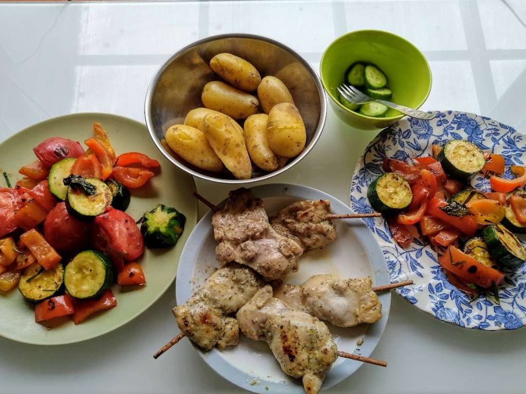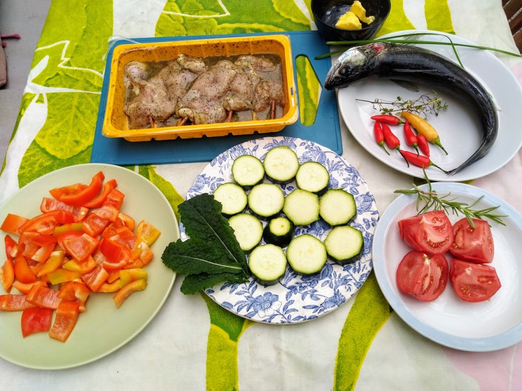 Ulkona kokkaaminen ja ulkona syöminen on ilo. Miika kunnostautui viime viikonloppuna käymällä yökalassa. Hän sai lähes kaksikiloisen hauen ja vähän pienemmän kuhan. Minä pilkoin kasvikset muurikalle ja keittelin perunat. Miika perkasi kalat ja lupasi laittaa kotona haukipullia.