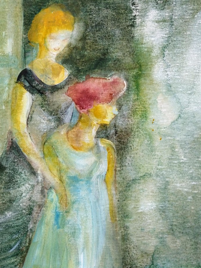 Jatkoin akryyliväreillä. Käytän opettajan mielestä maalatessani liikaa vettä. Ostin kiiltävää mediumia, joka tekee väreistä kuultavia. Lopputulos muistuttaa edelleen akvarellia.