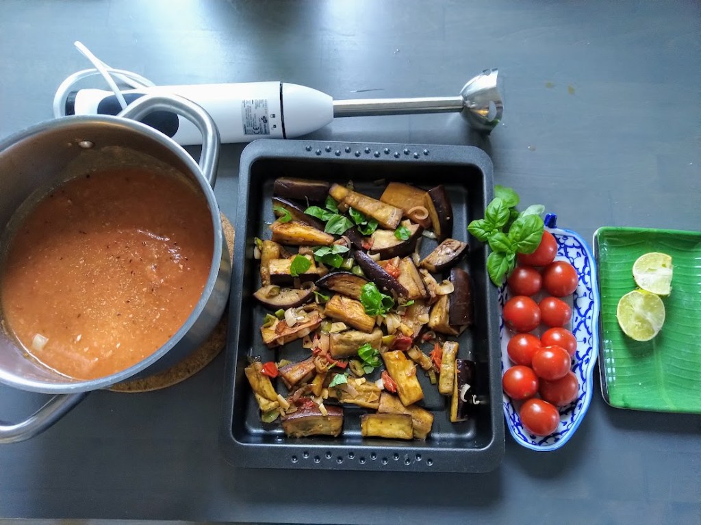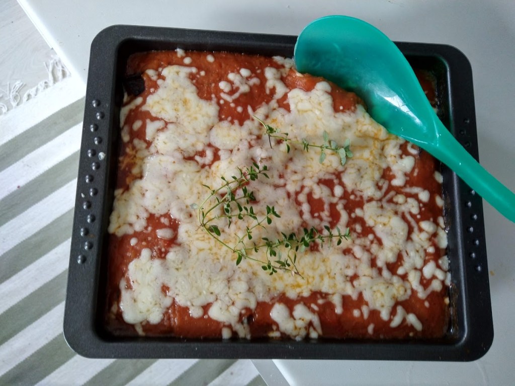 Kokkasin chilillä terästetyn tomaattikastikkeen. Laitoin ainekset uunivuokaan ja ripottelin päälle juustoraastetta.