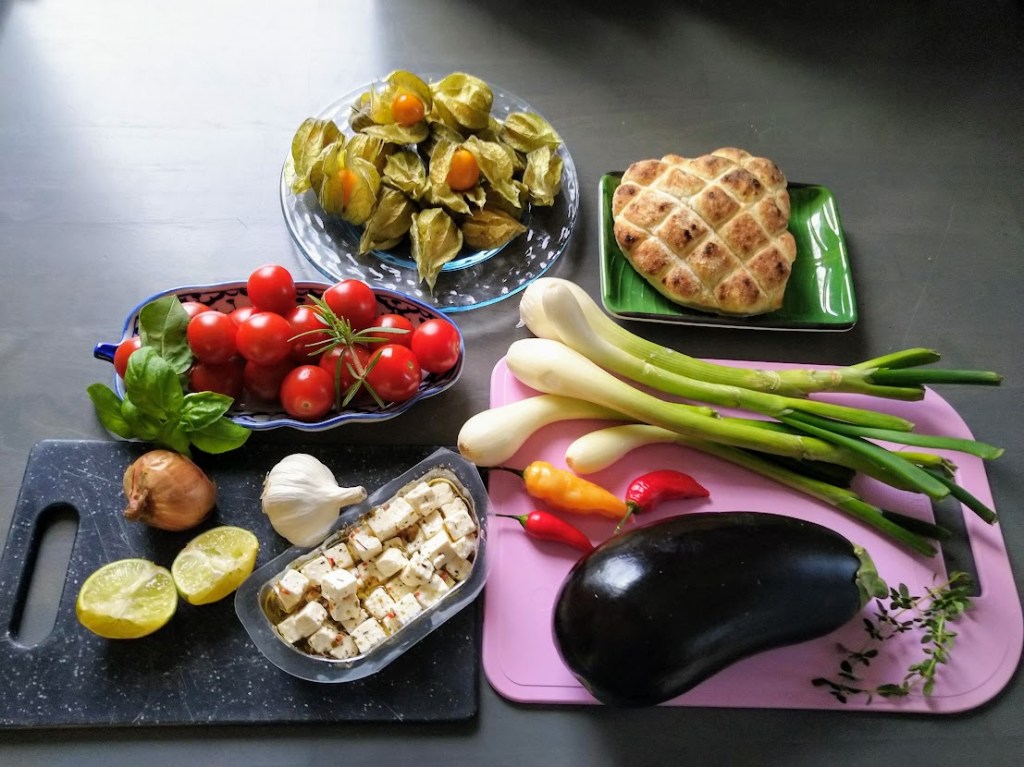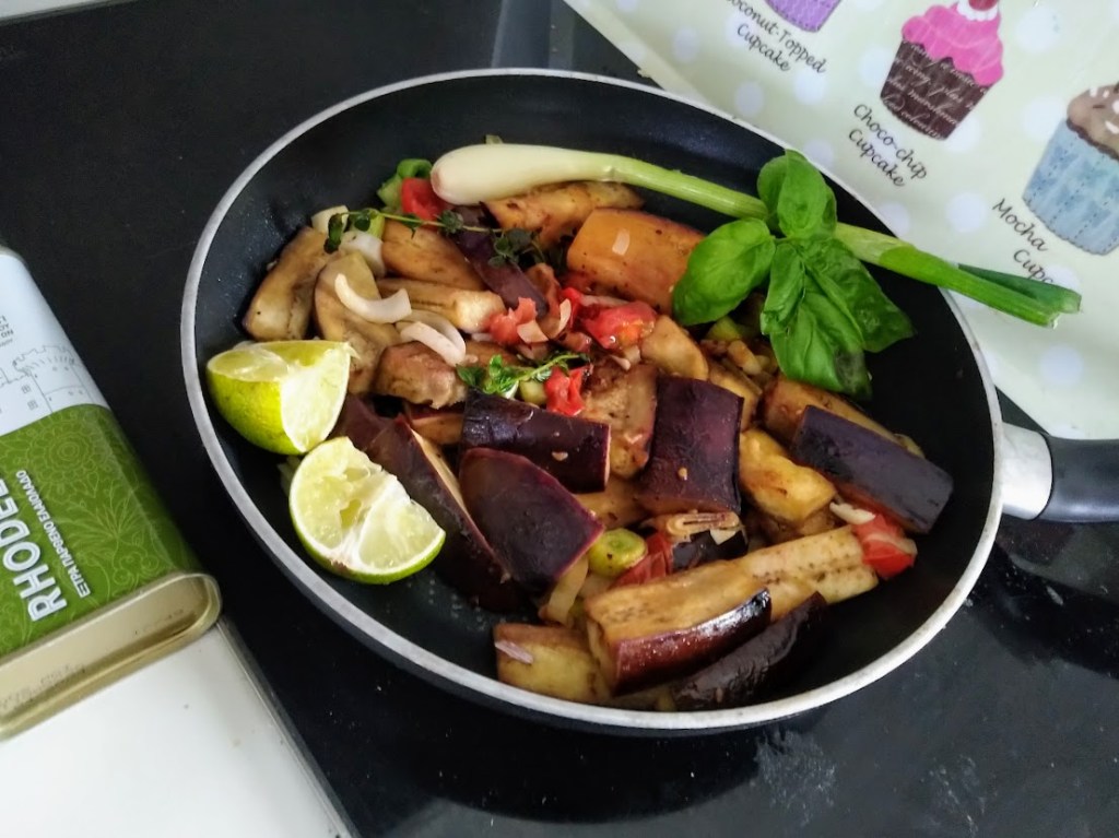 Lohkoin munakoison ja itketin sitä hetken. Kuullotin viipaleet pannulla oliiviöljyssä.