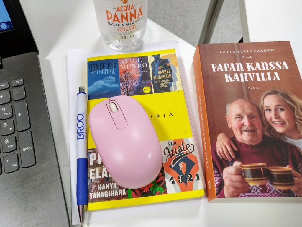Tänään jatkoin kirjoittamista HAMK:ssa Visamäessä. Taija opettaja toi kirjamessuilta lahjoja. Saimme valita sokkona kirjan, joka johdatti harjoitustehtävään. Tekstissä piti käyttää kirjan nimeä ja aikaisemmin listaamiamme tunnelmia. Valintani oli helpotus.