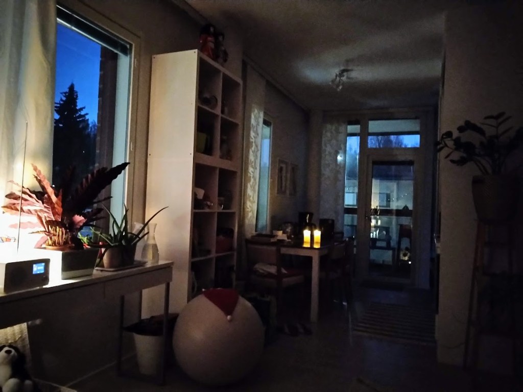 Toinen adventtisunnuntai. Kynttilät palavat keittiön pöydällä. Istun sohvan nurkassa torkkuhuovan alla ja nautin rauhallisesta sunnuntai-illasta. Lunta sataa hiljakseen ja parvekkeella kimaltelee valonauha, jonka hankin valaisemaan vuoden pimeintä aikaa.