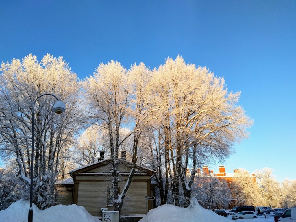 Taivas oli huikean sininen ja puut huurteessa, kun kävelin eilen gallerialle.