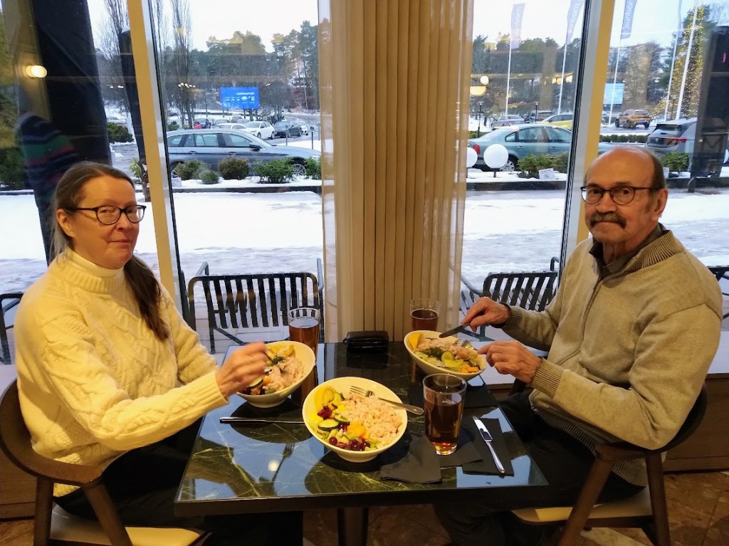 Nautimme hulppeat katkarapusalaatit heti majoittumisen jälkeen. Allasosastolla ei ollut tungosta. Kelluimme lämpimässä ulkoaltaassa sadepisarat kasvoilla. Illalla ravintola Rucola tarjosi aidon oloisia italialaisia makuja.